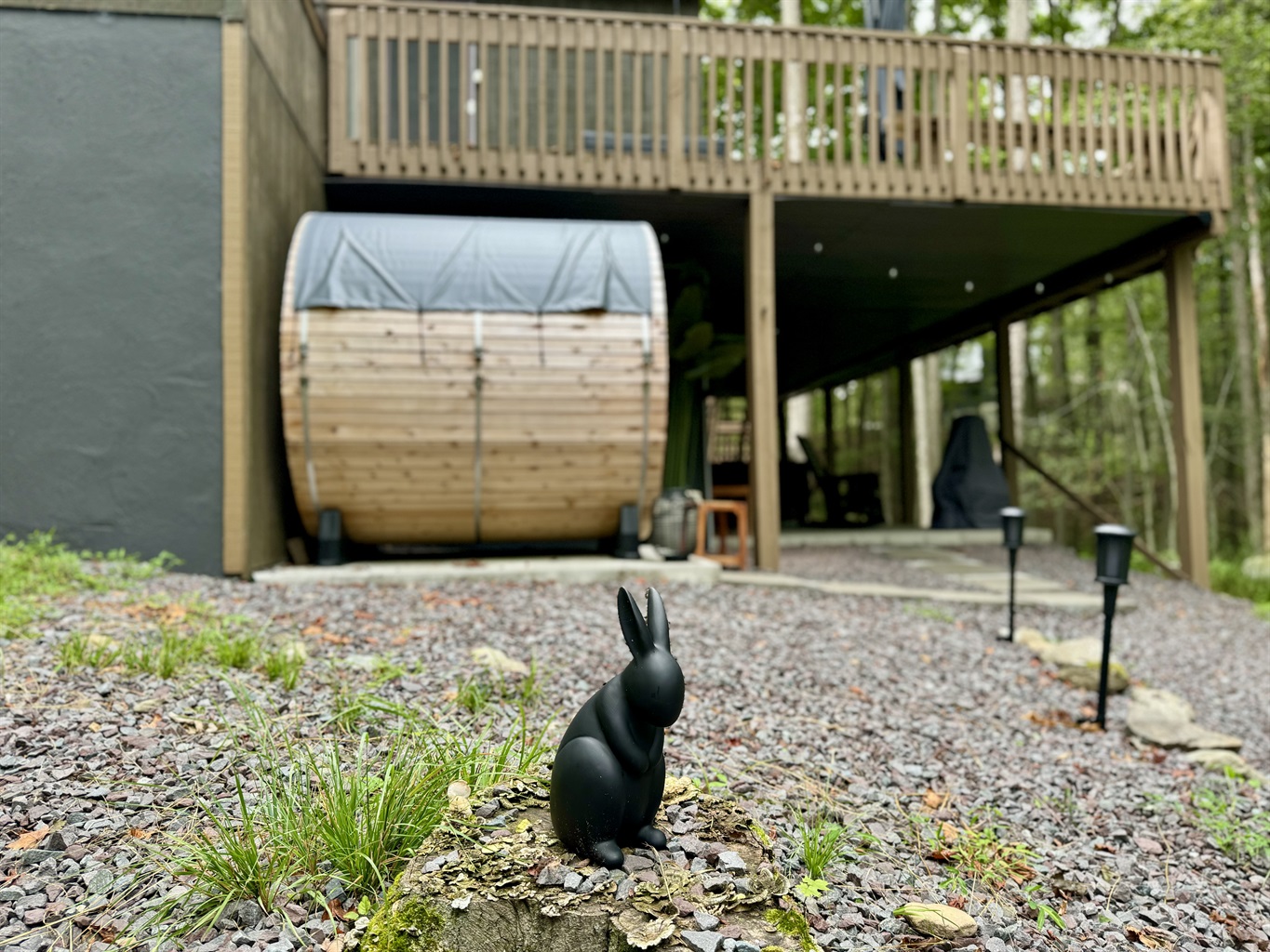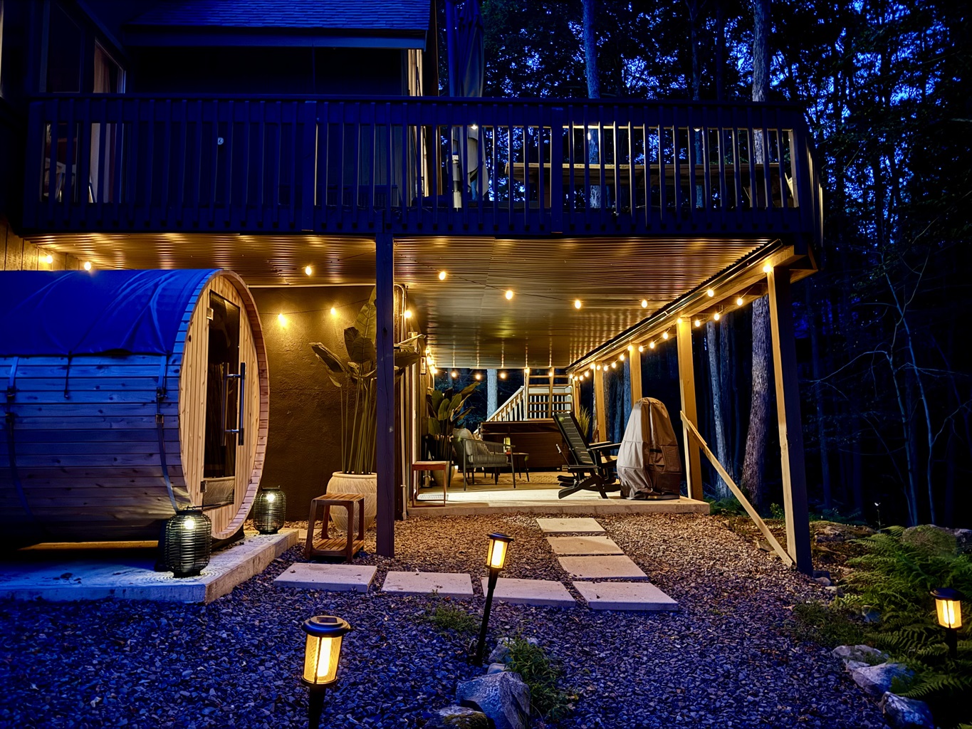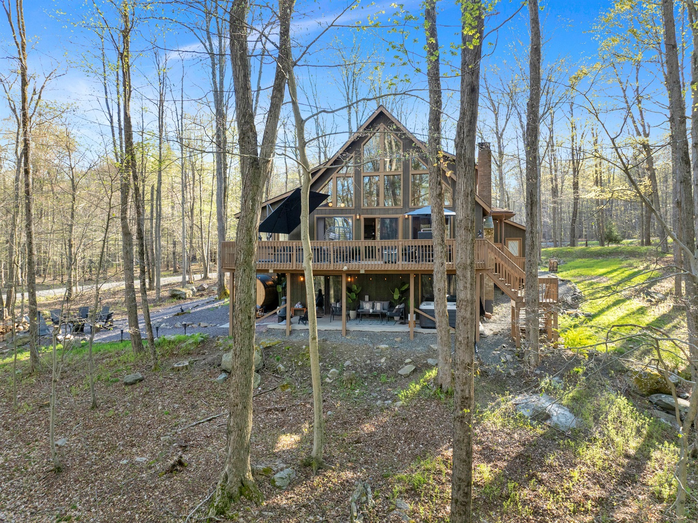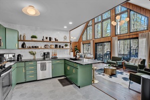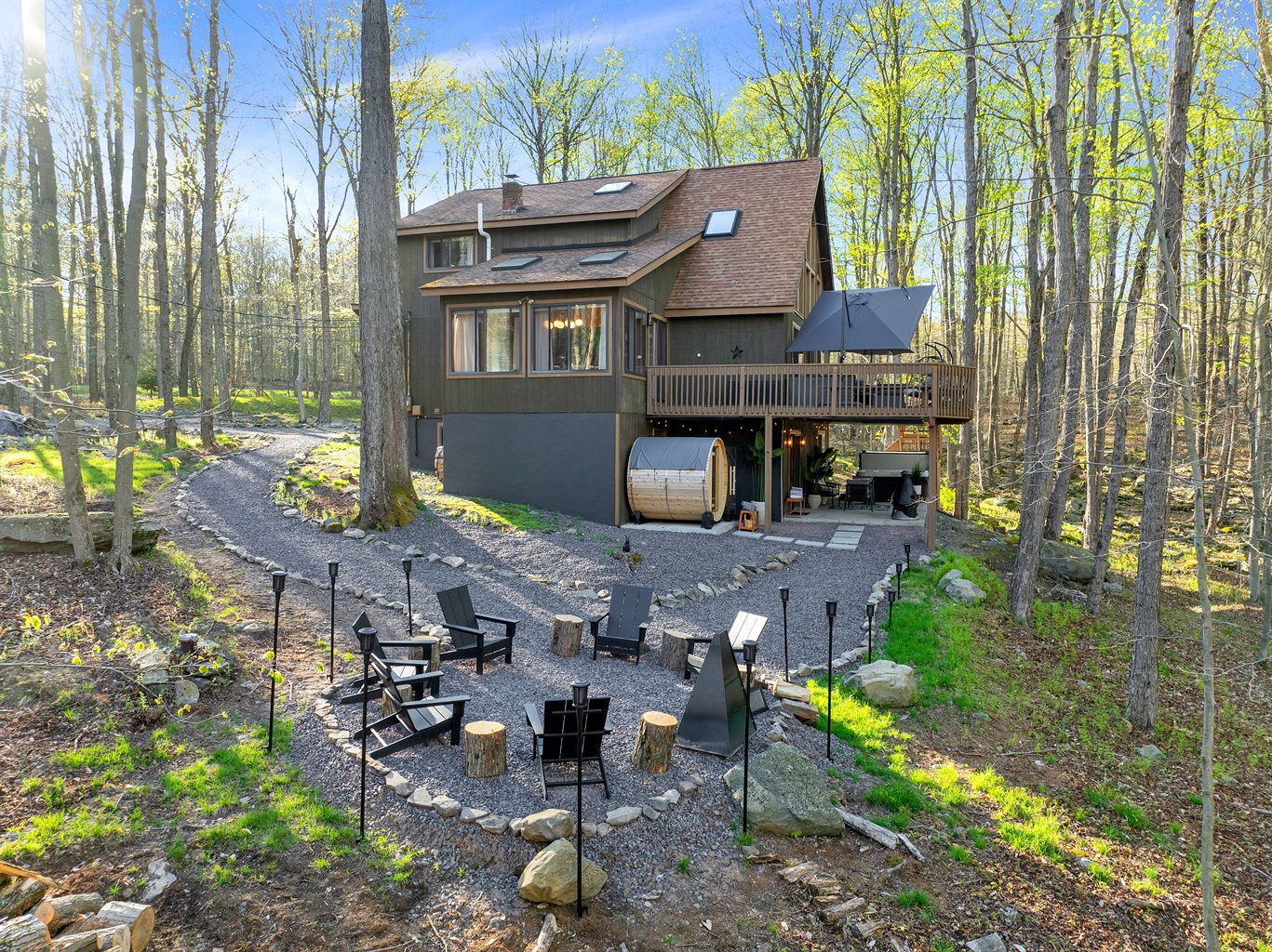 Our chalet spans three floors with a large loft, arcade game room, theater room, and well stocked kitchen+coffee bar, as well as an amazing outdoor space with covered patio, 7-seat hot tub, barrel sauna, multiple fire pits, ensuring everyone in your group finds something to enjoy. Whether you’re an outdoor adventurer, video gamer, music lover, bookworm, wellness enthusiast, karaoke star, poker shark, Lego maniac, gourmet chef, or coffee aficionado, we’ve got you covered – rain or shine. Oh, and bring the electric car.
